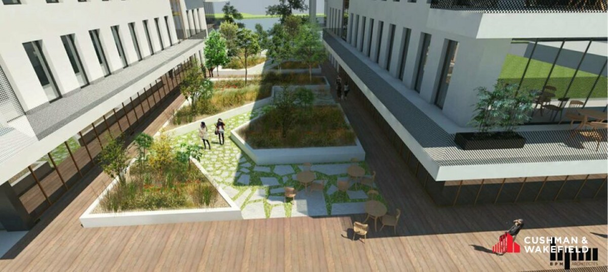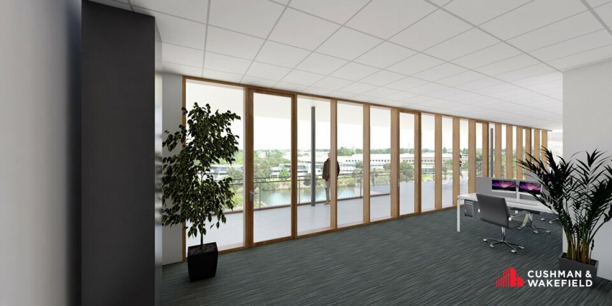 Aménagements intérieurs : plateaux livrés aménagés prêts à cloisonner, faux plancher technique, moquette ou PVC au choix, faux plafonds avec pavés LED, murs périphériques peints, climatisation réversible,