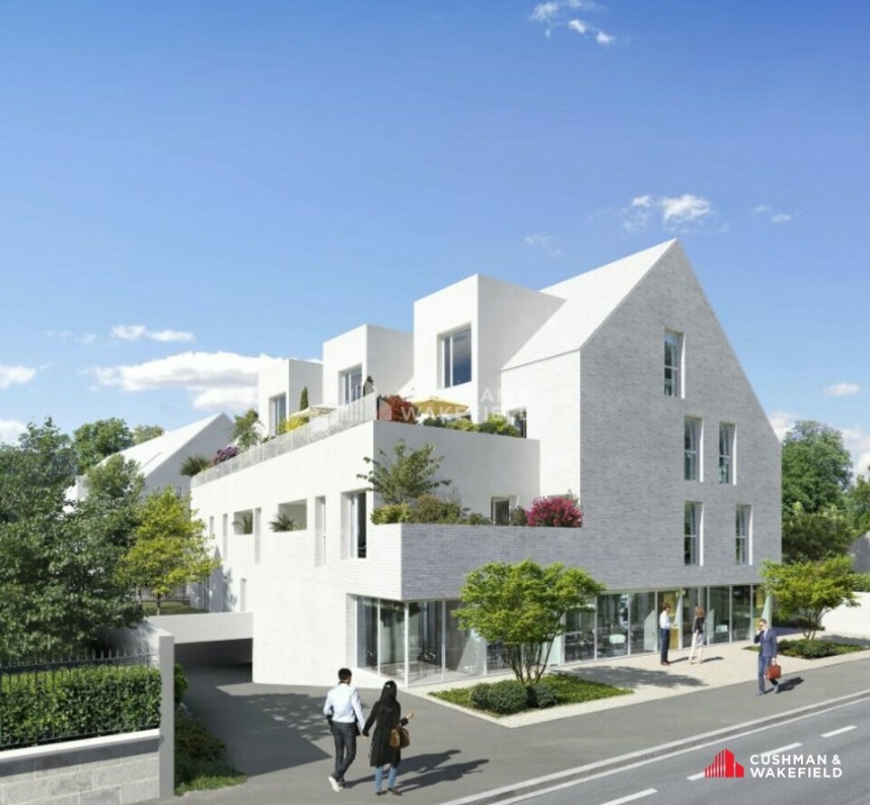 Un local commercial d'une surface de 213 m² neuf à réserver, livré brut de béton avec fluides en attente, menuiseries et vitrines posées.