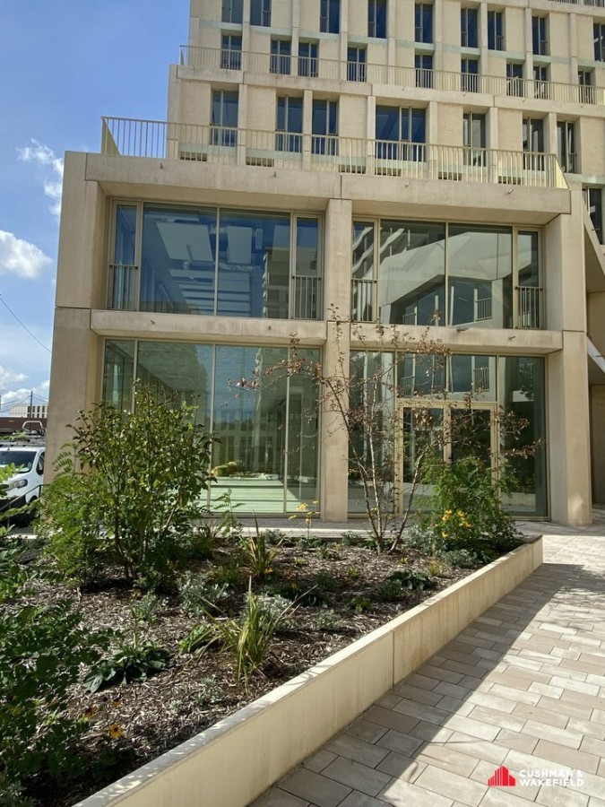 Livraison brute de béton, avec fluides en attente et vitrines/menuiseries posées.