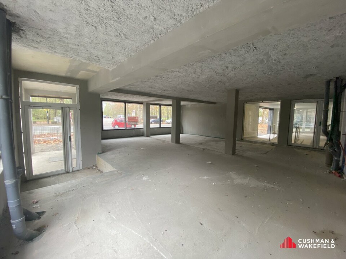 Le local est livré brut de béton, avec fluides en attente, vitrines posées et accès PMR.